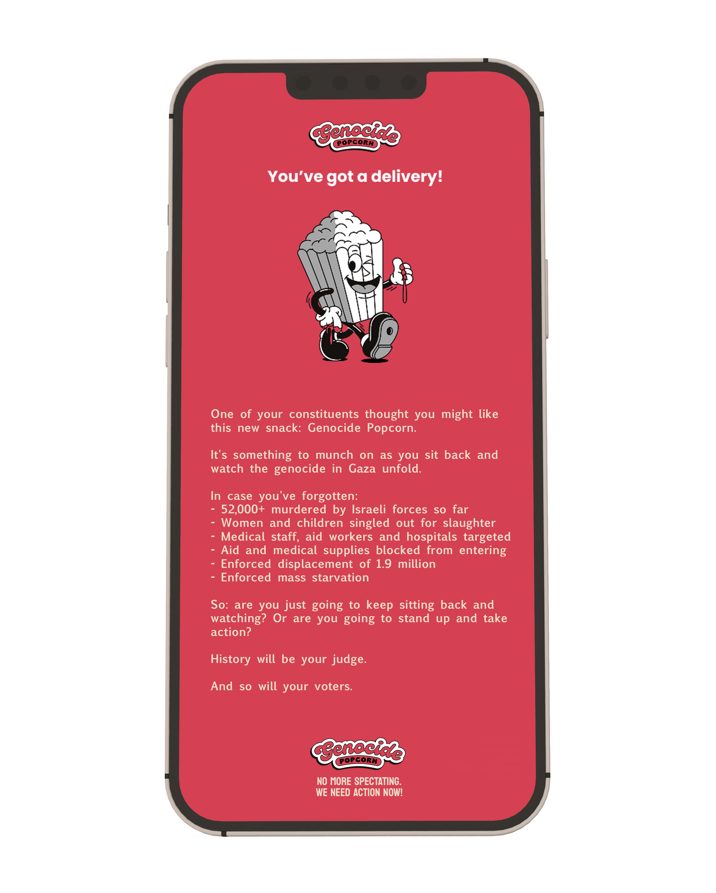 View fullsize SEND Digital Popcorn to a politician! Politicians all over the world are sitting by and watching as Israel commits genocide in Gaza. Genocide Popcorn is the perfect snack to shame the spectators.Send it to your local Member of the European Parliament (MEP) - and let them know you’re watching them watching. You can send it to other politicians too.To send, enter your MEP's name in the box below and select the address from the drop-down list. To send it to any other politician, just enter their email address manually. If you do not know your MEP’s address use the link below to search the database.https://www.europarl.europa.eu/meps/en/search/advanced Email Address SEND NOW! Thank you. Your popcorn has been sent.Now head to our donations page to support organisations helping the people of Gaza.